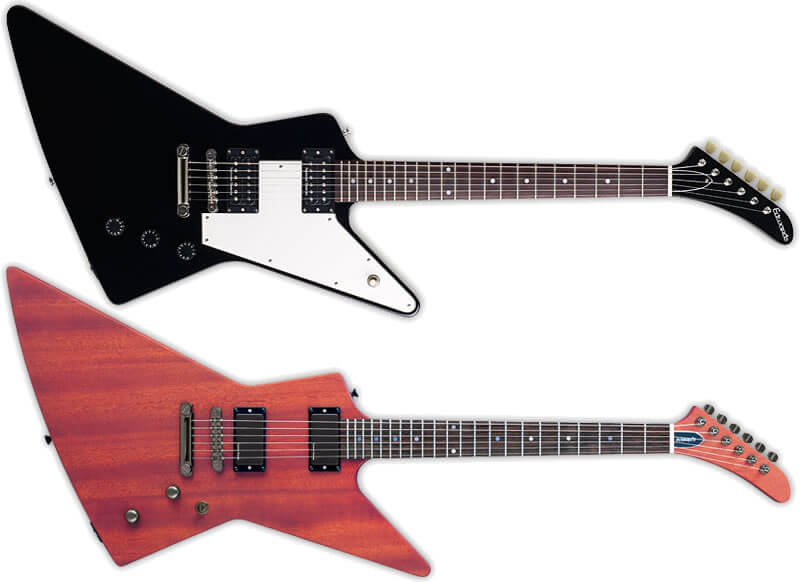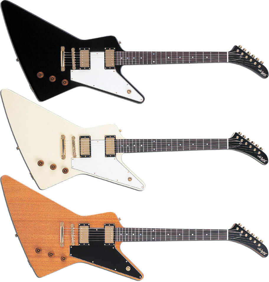 備考:「エクスプローラー」の名称はギブソン製品の登録商標なので、ギブソンとエピフォン でしか使用することができません。それゆえ他のブランドからリリースされているものは「エクスプローラー・タイプ」や「エクスプローラーのコピーモデル」と呼ばなければなりませんが、それではあまりに不便なので、ここでは便宜上すべてをひっくるめて「エクスプローラー」と呼んでいます。