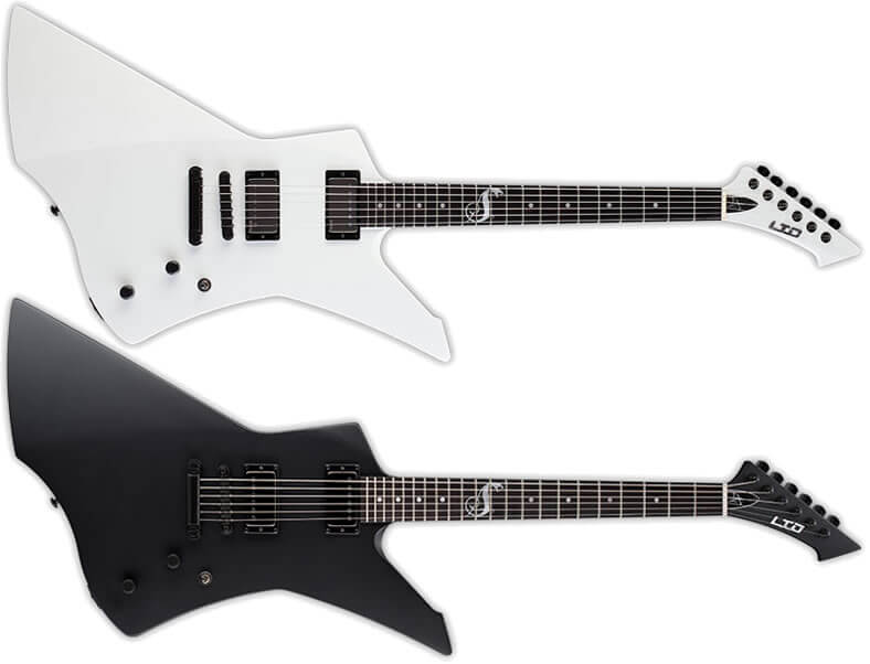 ESPのギターを求めやすいグレードでリリースしているLTD から、メタリカ所属のジェイムズ・ヘッドフィールド氏シグネイチャーモデルが出ています。指板インレイのデザインから「スネークバイト」と名付けられた本機はエクスプローラーのシルエットをアレンジしたもので、木材やネック寸法などにギブソン的な仕様を残しながらも操作系やパーツに違いのある、オリジナルなギターになってます。