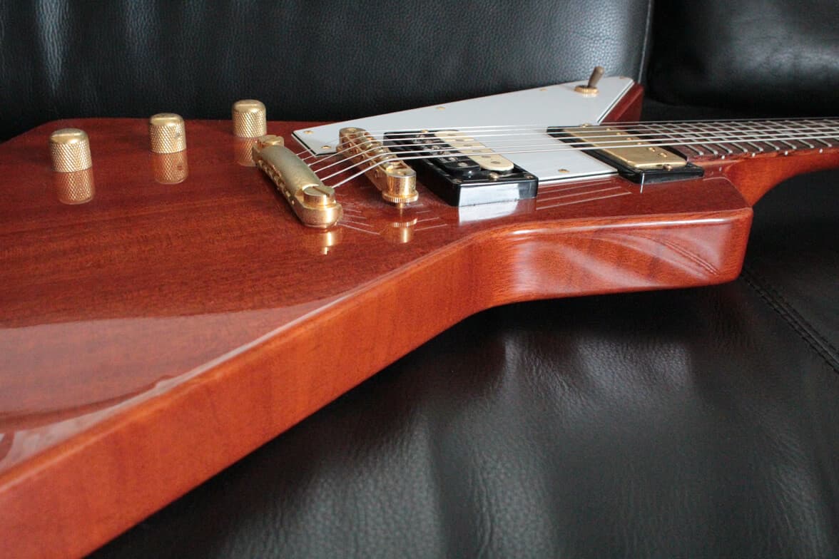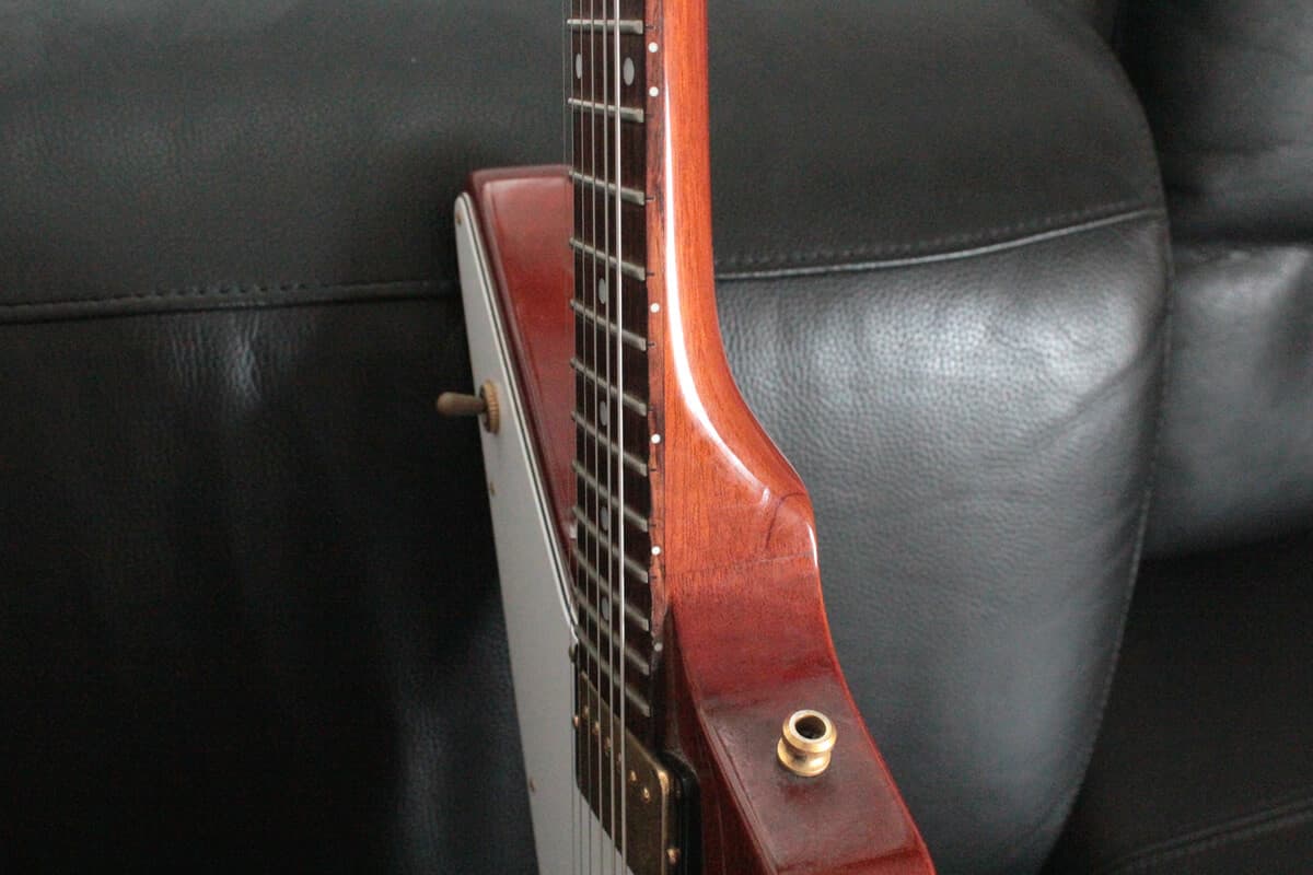 逆に、ストラップを使用し立って演奏する場合にはヘッドが下がっていく「ヘッド落ち」が起きやすく、その場合には左手でネックを持ち上げながら演奏する必要があります。これはSGやフライングVでも起こることですが、エクスプローラーの場合にはネック側のストラップピンをネックヒールに移動させることでボディバランスが変化し、このヘッド落ちを解消できるようです。そのため多くのブランドでは初めからストラップピンをネックヒール部に配置しているほか、本家ギブソンのエクスプローラーもボディサイドからネックヒールへと配置変更しています。