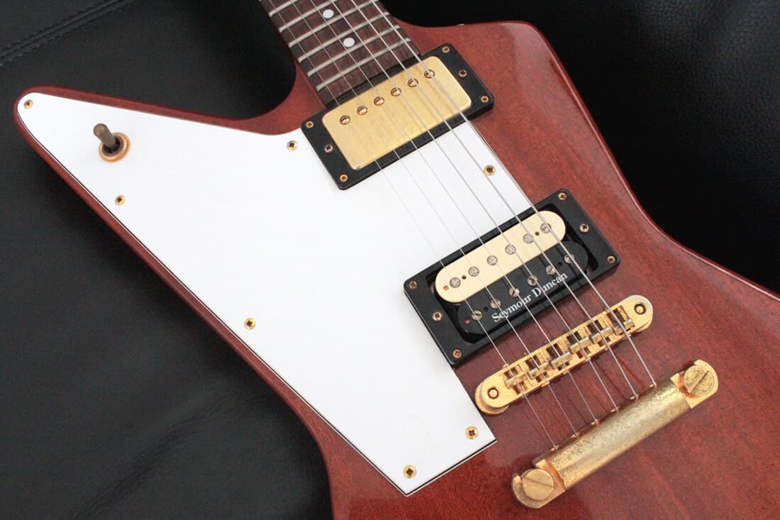 ピックアップ配列は「2ハムバッカー」を基本としており、P-90 や普通のシングルコイルを搭載したエクスプローラーは古今東西ほぼありません。このことから「エクスプローラーは2ハム」というのが一つの常識となっており、「太く甘いパワフルなサウンドで、ロックに最適」というイメージが出来上がっています。