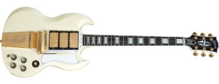 ギブソン・カスタムショップ「1963年式SGスペシャル」は、当時の仕様や製法を限りなく忠実に再現した、ヴィンテージギターのクローンと呼べるギターです。しかしミディアムジャンボフレットを採用、バーブリッジのイントネーション改善など、現代のギターとしての演奏性もしっかり考慮しています。チェリーの「リイシュー」が通常版で、ホワイトは「マーフィーラボ・コレクション」に属し、軽いエイジドがかかっています。